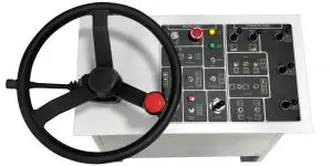 The simulator operator cab is a replica of the pushback equipment cab with an actual seat, force feedback steering and controls. All the controls are placed in ergonomically correct locations. The engine dynamics of the equipment are realistically designed to maximize the training value with respect to equipment operations under different conditions. TecknoSIm Simulators comes with an option of equipment specific simulator cab or generic configuration. TecknoSIM Convertible Kit options allow the user to accommodate multiple equipment types in the same simulator base unit.